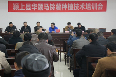為進(jìn)一步提高馬鈴薯種植水平,加快潁上縣馬鈴薯高產(chǎn)栽培新技術(shù)的推廣,增加農(nóng)民收入,12月14日,由安徽華頌農(nóng)業(yè)科技有限公司、紅星鎮(zhèn)人民政府承辦的潁上縣華頌馬鈴薯種植培訓(xùn)會(huì)在紅星現(xiàn)代農(nóng)業(yè)服務(wù)中心舉行。潁上縣農(nóng)委、華頌種業(yè)(北京)有限公司相關(guān)負(fù)責(zé)人,以及全縣各農(nóng)業(yè)綜合服務(wù)站站長(zhǎng)、種植大戶(hù)、馬鈴薯種植相關(guān)知名企業(yè)負(fù)責(zé)人共200余人參加了本次培訓(xùn)會(huì)。